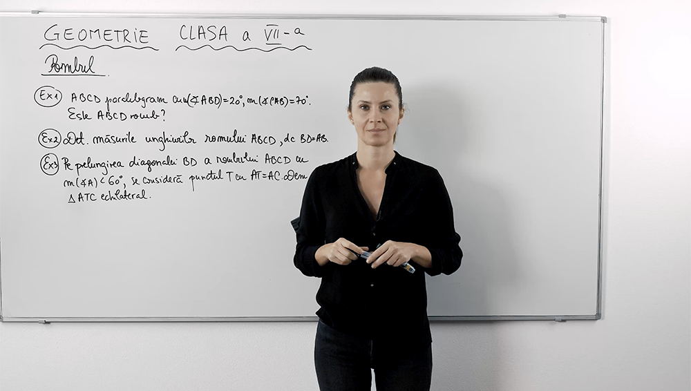 În această lecție video exersezi calculul unghiurilor și perimetrelor în romb. Vei vedea exemple pas cu pas pentru a determina măsura unghiului interior, lungimea unei laturi din perimetru și proprietăți de paralelogram, folosind diagonalele care se înjumătățesc. Explicațiile prietenoase și desenul ghidat îți oferă claritate rapidă și îți sporesc încrederea în rezolvarea exercițiilor.