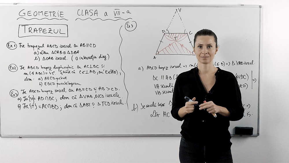 În acest tutorial video afli cum demonstrezi congruența unor triunghiuri în trapezul isoscel, folosind cazul latură-unghi-latură. Vei vedea pas cu pas de ce diagonalele sunt egale și cum unghiurile de la bază îți permit să demonstrezi că anumite triunghiuri sunt isoscele, ca de exemplu cele formate de intersecția diagonalelor. Lecția include exemple clare și explicații ușor de urmărit, perfecte pentru a stăpâni proprietățile speciale ale trapezului isoscel.