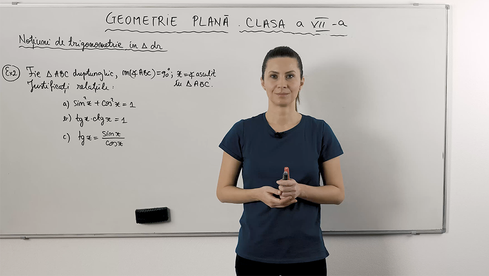 Trigonometrie în triunghiuri dreptunghice, identități fundamentale și relații între funcțiile trigonometrice devin accesibile prin exemple de demonstrații. În această lecție video, elevii urmăresc pașii de justificare pentru sin²x+cos²x=1, tg·ctg=1 și tgx=sinx/cosx, învățând să aplice teorema lui Pitagora și definițiile funcțiilor trigonometrice pentru a verifica diverse relații între acestea.