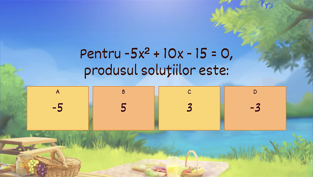 joc interactiv pentru exersarea relațiilor lui Viete cu exerciții de identificare a sumei și produsului rădăcinilor. Răspunde rapid la întrebări despre S=–b/a și P=c/a, primește feedback instant și urcă nivelurile pentru a-ți testa cunoștințele. Un mod distractiv și eficient de a aprofunda formula lui Viete!